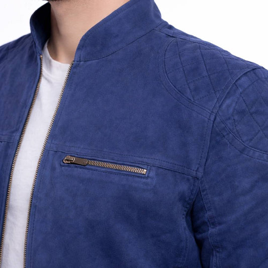 Men’s Blue Suede Leather Moto Jacket – Handcrafted Slim Fit Cafe Racer